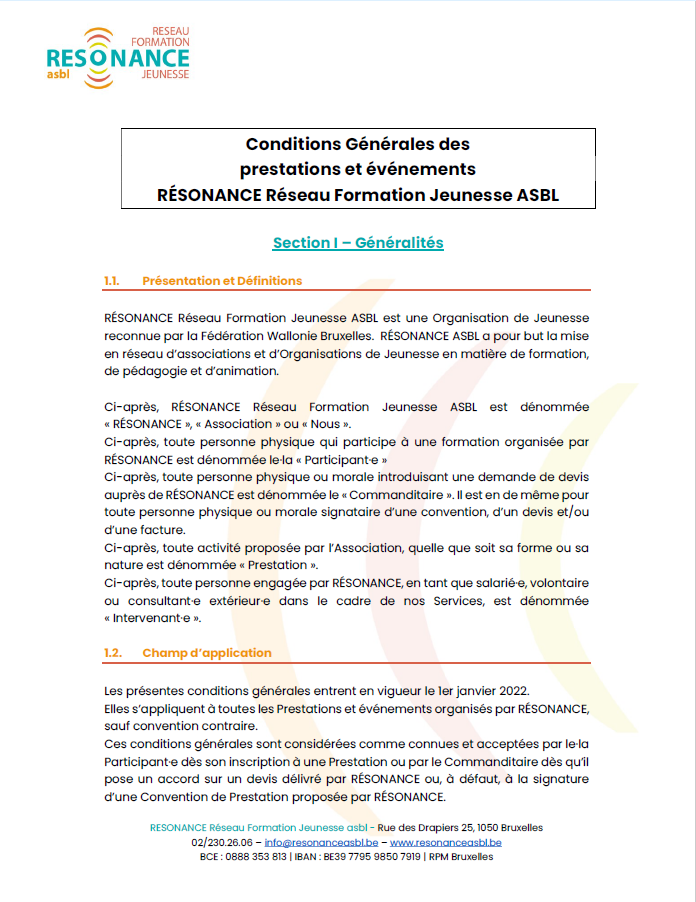 Ce document élaboré par RÉSONANCE Réseau Formation Jeunesse ASBL présente les conditions générales applicables à ses formations, évènements et prestations proposées à la demande. Il détaille notamment :